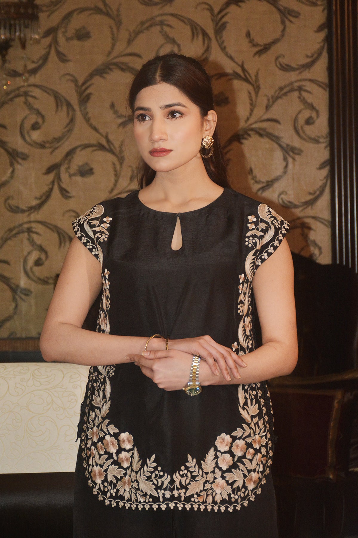 Shirt: Sapphire silk top with embroidery details